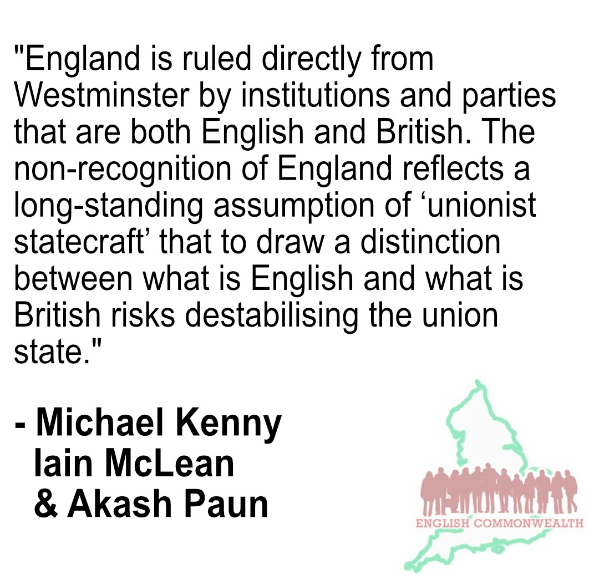 This England problem is actually caused by a *lack* of English nationalism, by a unionist political class at pains to promote British identity over English identity. In England, unionist, British politicians invoke Britain as the ‘us’ or the ‘we’. It is Britain that is the national community, even when the policy area under discussion is England-only. England is not imagined as a political community, a social democracy, a demos or a nation unto itself.
