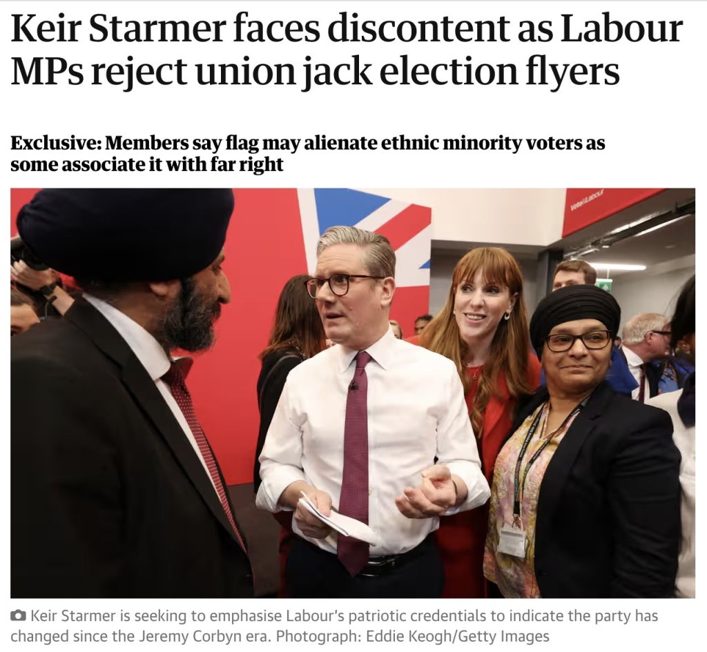 The almost total avoidance of the flag of England from Labour Party campaigning (when contrasted with their use of the Scottish and Welsh national flags in those nations) does indicate that Labour is uncomfortable with political expressions of English identity while at the same time trumpeting their comfort about Scottish and Welsh identity.