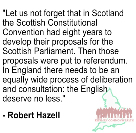 Adapting the words of the 1998 Scottish Claim of Right, we demand the sovereign right of the English people to determine the form of Government best suited to their needs. Just like Scotland, England is a nation and, as such, we have the right to self-determination. Equality within a ‘Union of Equals’ demands that right. The referendums in 1998 leading to the establishment of the Scottish Parliament and Welsh Assembly set a precedent: if the people of Scotland and Wales should be consulted on whether they want their own national governments, then so too should the English. In a sense, the issue is as simple as that: let the people of England decide how they wish to be governed.